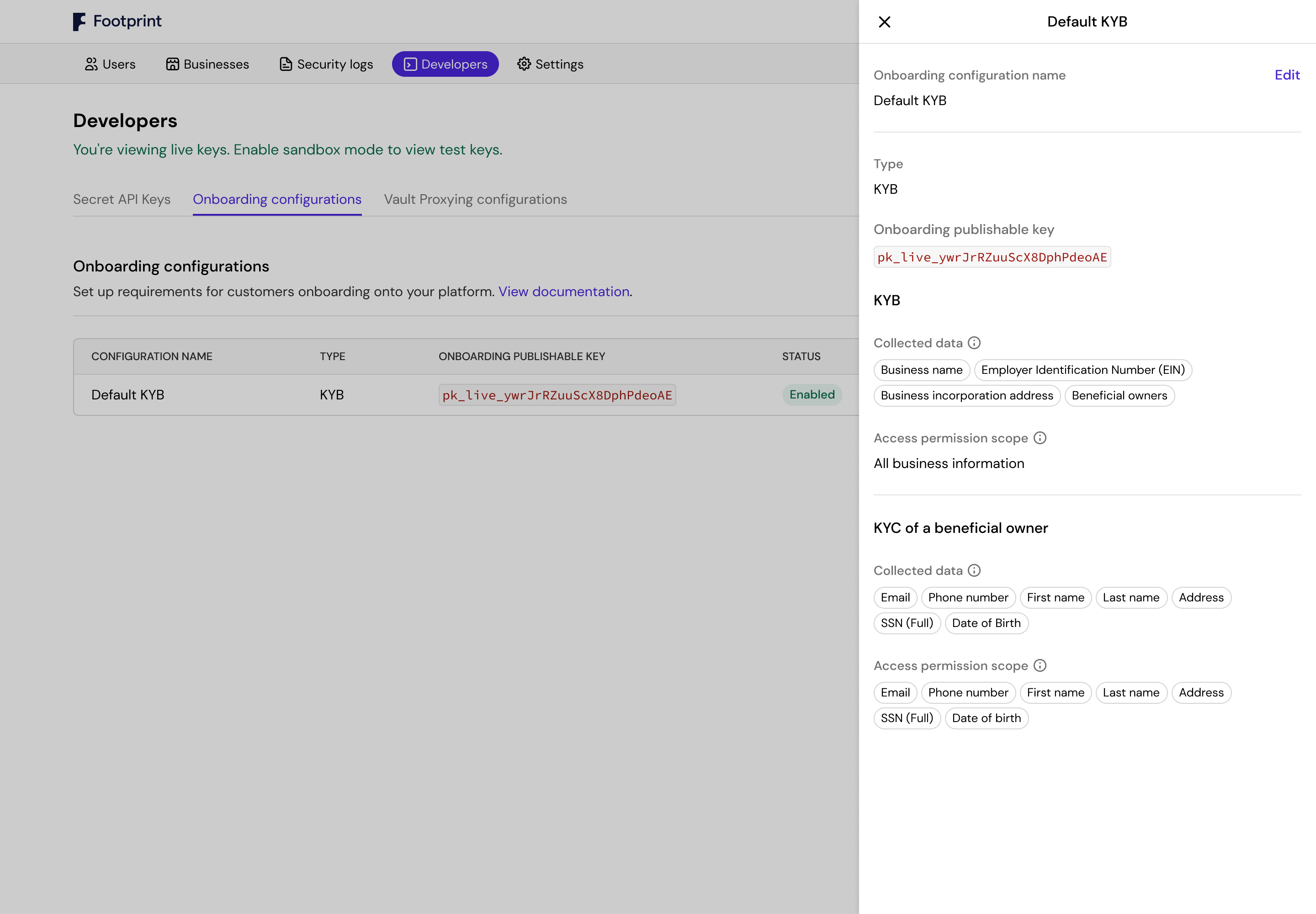 Know-your-business or "KYB" is an important part of the onboarding process for many financial products for businesses. Just like KYC (know-your-customer), in order to onboard an entity onto your platform you need to verify not only the business itself but also the beneficial owners of that business. Footprint makes this as easy as KYC with all of the business information vaulted securely.